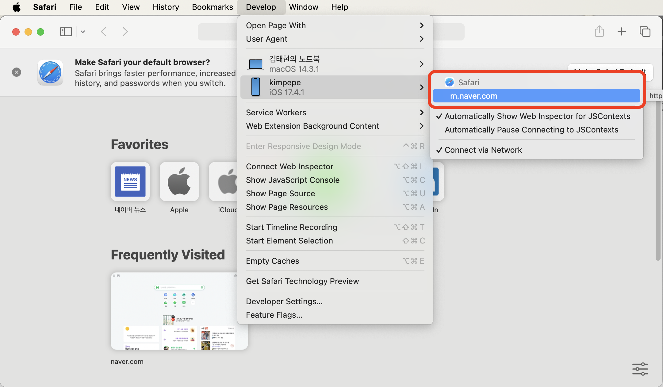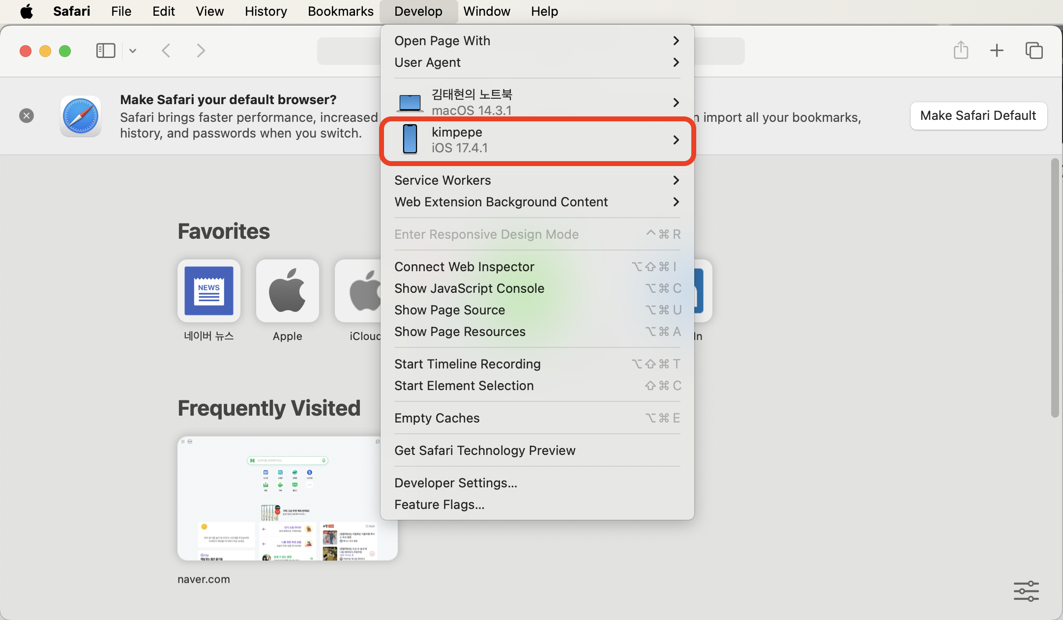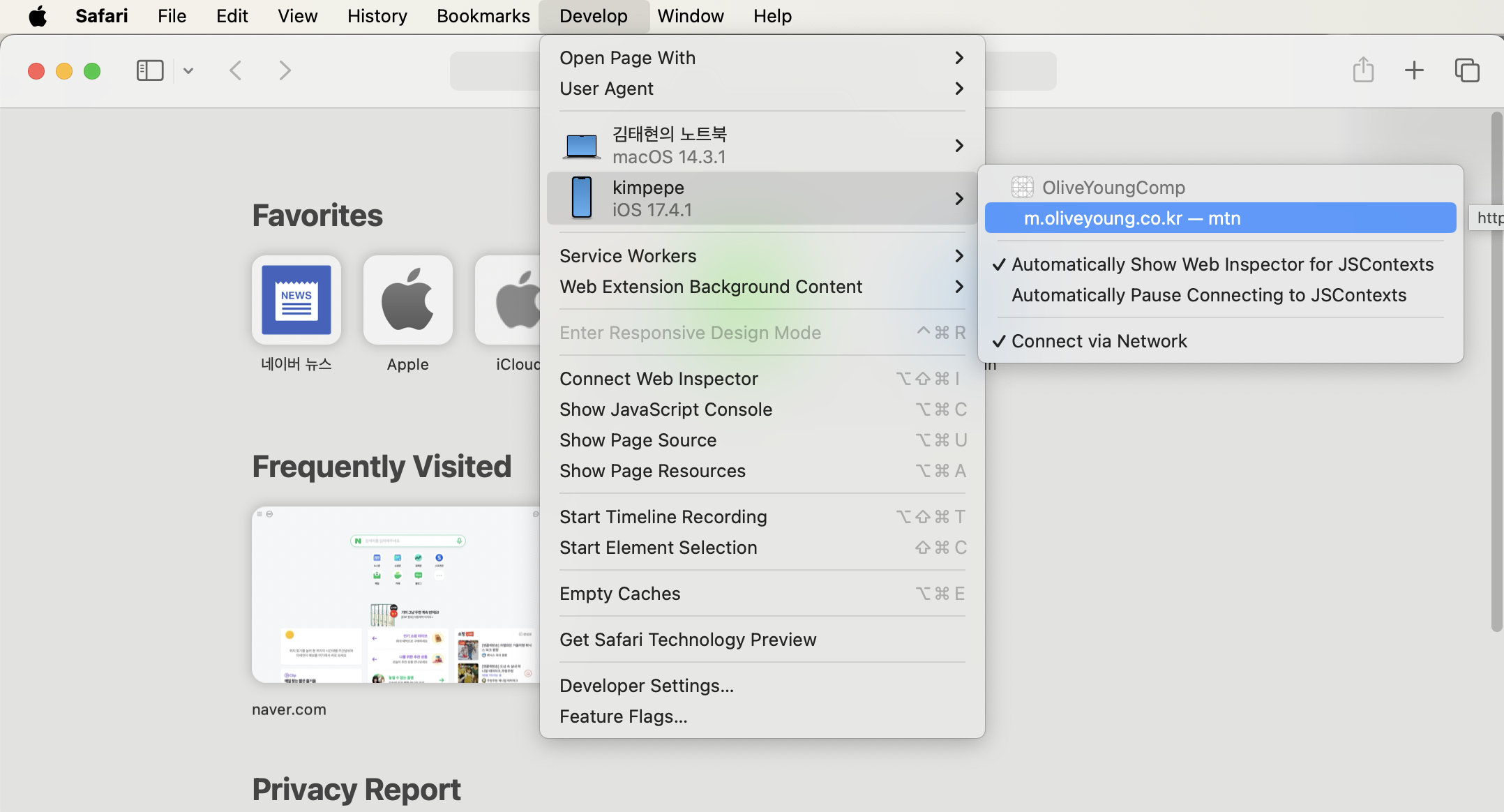 1. iOS 기기에서 실행 중인 `모바일 웹(Safari)`을 Mac의 Safari 개발자 모드로 분석