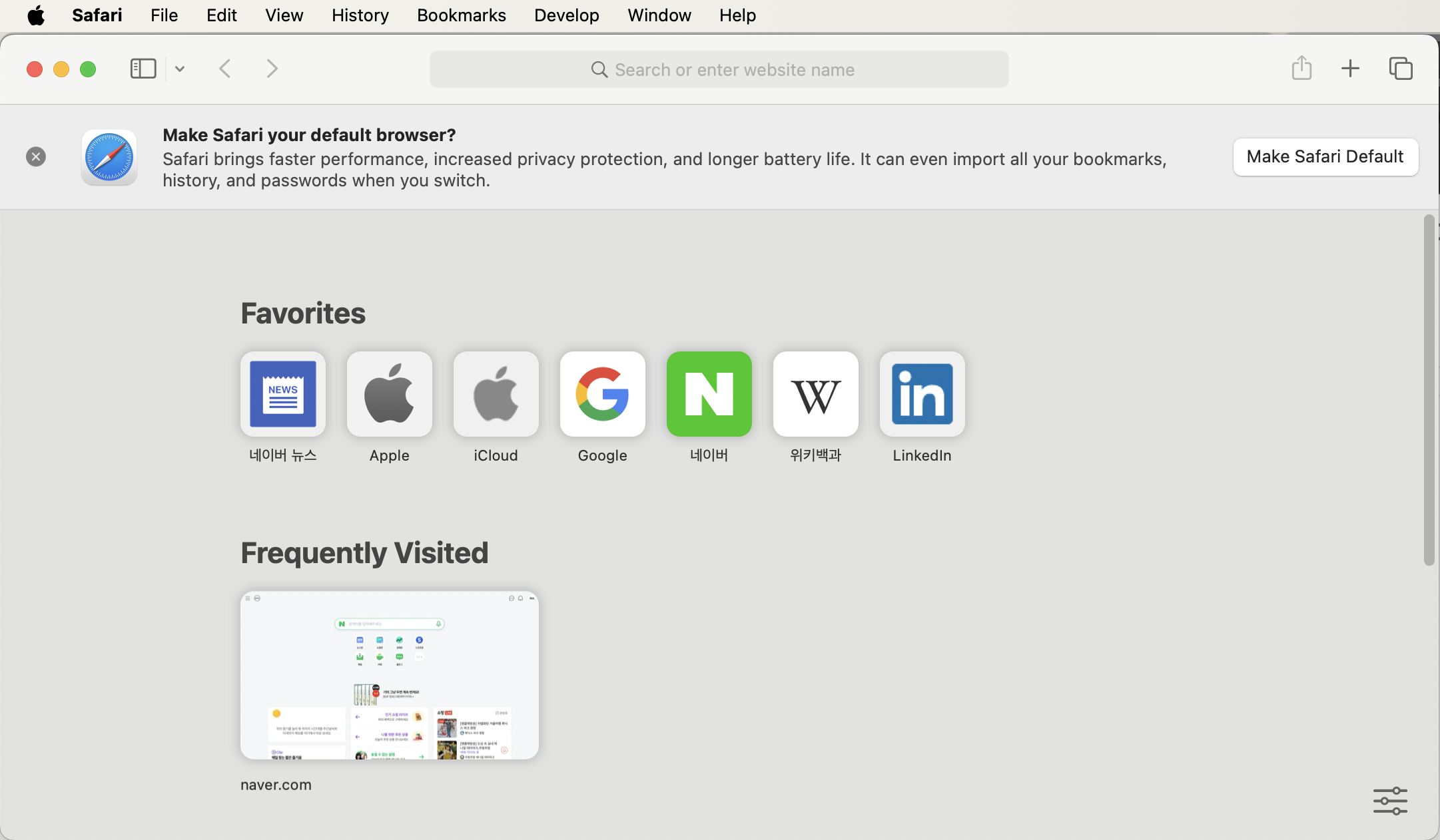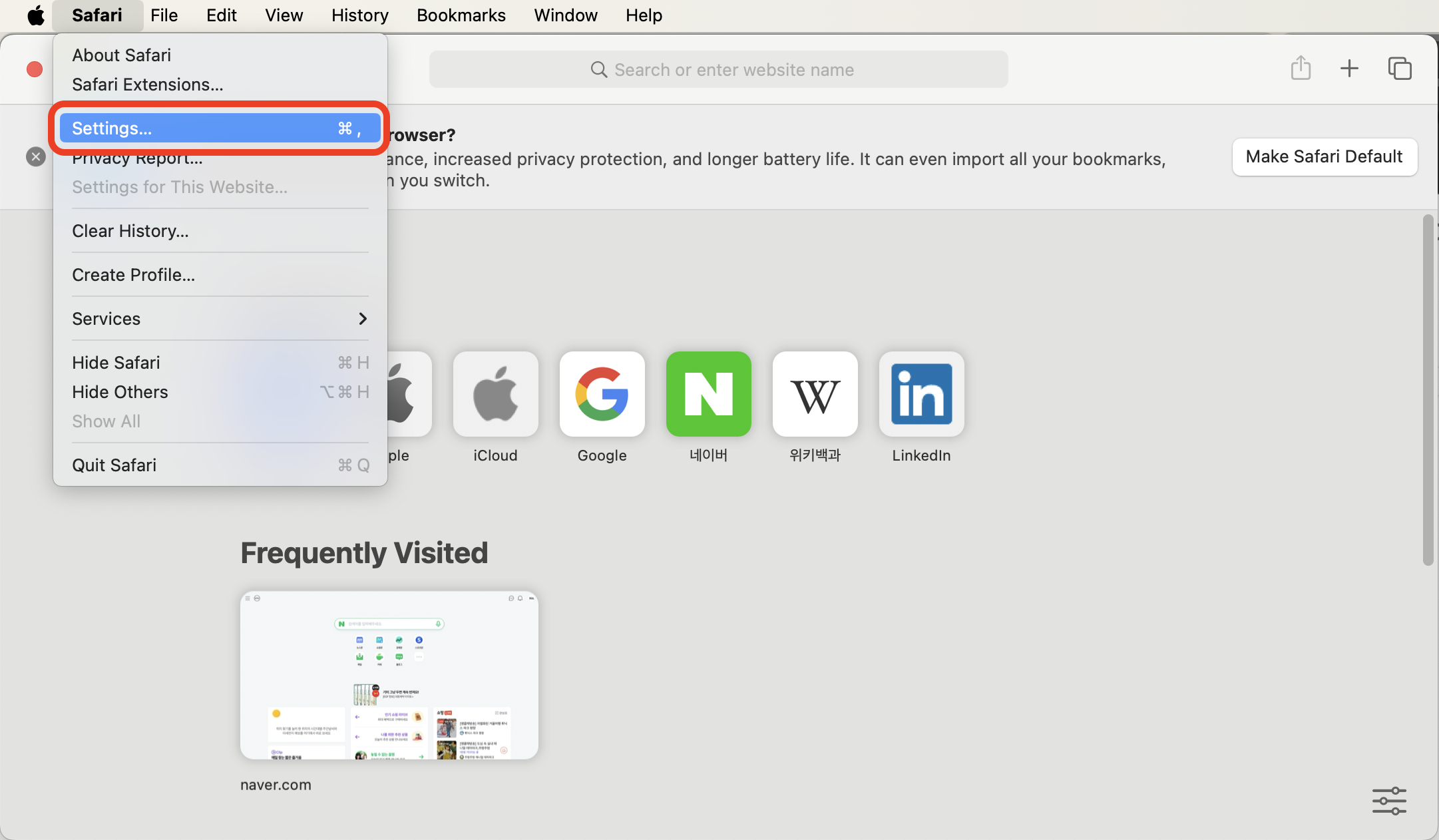 - 상단 메뉴 바에서 `Safari` → `환경설정(Settings...)`