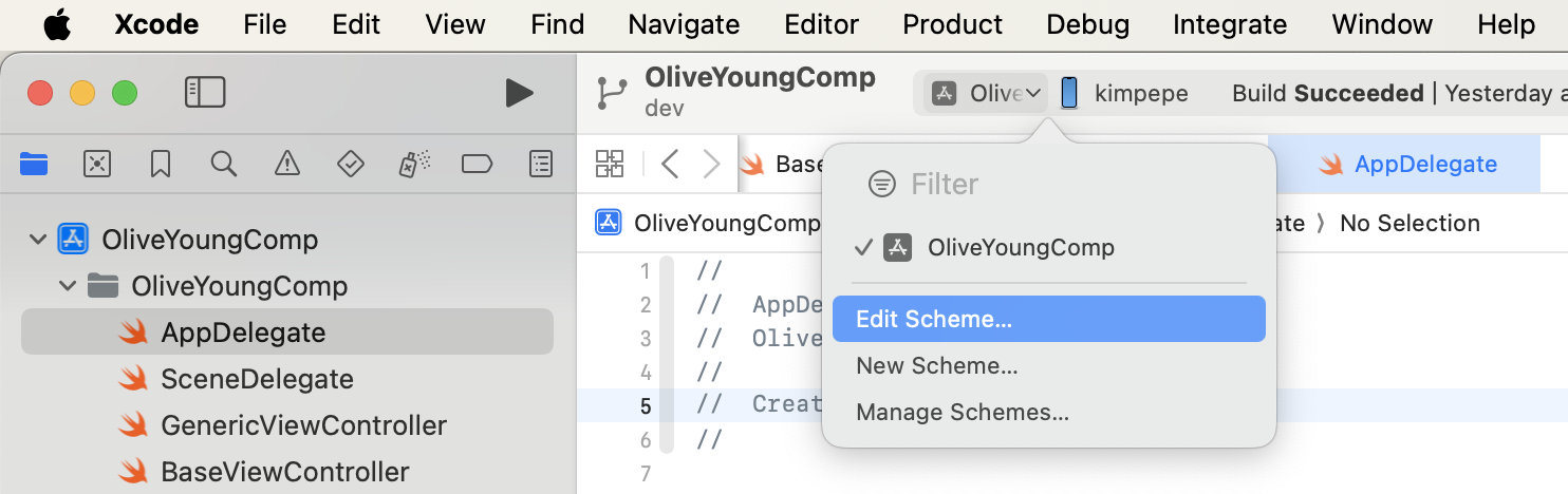 - 실행 중인 앱을 선택 → `Edit Scheme...` 선택